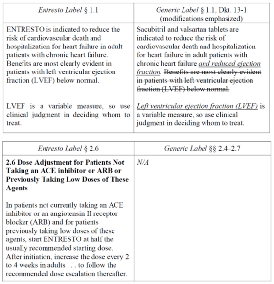 In brief, ENTRESTO was once approved “to reduce the risk of cardiovascular death and hospitalization for heart failure in patients with chronic heart failure (NYHA Class II-IV) and reduced ejection fraction” but its labeling was subsequently amended to reflect that the product is approved to treat all patients with chronic heart failure, and to add a new dosing regimen for specific patients. While denying a Citizen Petition from Novartis asking FDA to refuse to approve any ANDA that omits the new dosing regimen or changes the indication, FDA approved MSN’s ANDA on July 24, 2024. FDA, in its Citizen Petition Denial, stated that it retains the authority to approve generic labeling that modifies an approved indication and that it could lawfully approve generic labeling that omits the modified dosing regimen in ENTRESTO’s labeling. To that end, FDA approved the MSN ANDA without the modified dosing regimen and with the indication “to reduce the risk of cardiovascular death and hospitalization for heart failure in adult patients with chronic heart failure and reduced ejection fraction. Benefits are most clearly evident in patients with left ventricular ejection fraction (LVEF) below normal. Left ventricular ejection fraction (LVEF) is a variable measure, so use clinical judgment in deciding whom to treat.” The labels differed as such: (here)